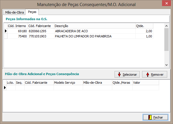 Acessa a tela de manutenção de Peças Consequência/M.O. Adicional.