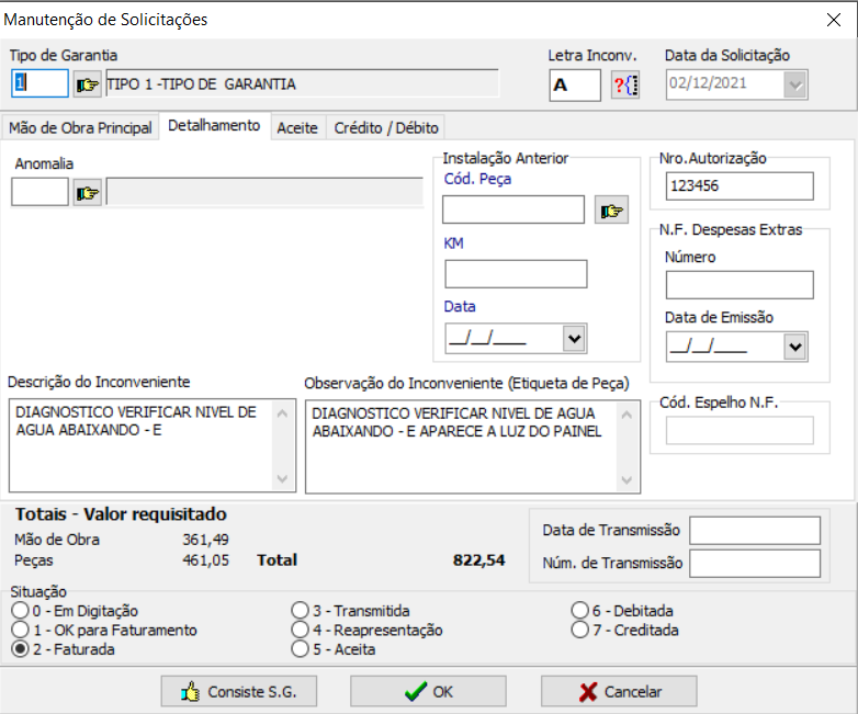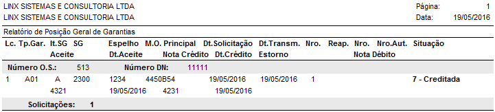Informações sobre o Crédito / Débito da solicitação de garantia. Maiores informações no item 5. - Totais – Valor requisitado