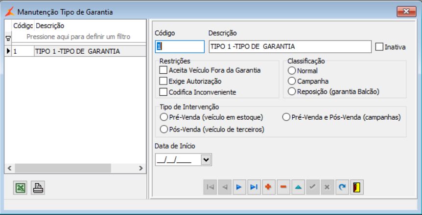 O cadastro é inserido manualmente através do menu Fabrica < Chrysler < Oficina < Garantia < Cadastros < Tipo de Garantia - Letra Inconv.