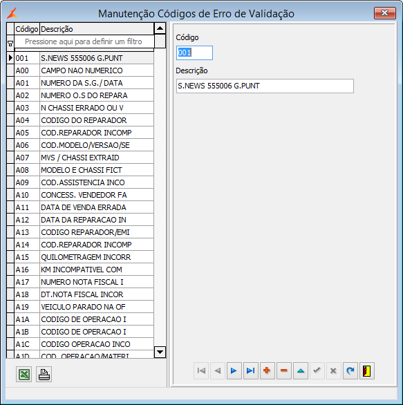 Menu Fábrica > Chrysler > Oficina > Garantia > Cadastros > Códigos de Erro de Validação