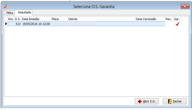 Clicar no botão "Abrir S.G." para incluir a O.S. no processo de garantia.