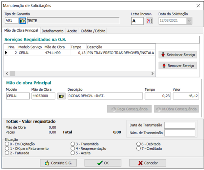Desmarca uma solicitação com status "Transmitida", para efetuar manutenção ou nova transmissão. - Manutenção de Peças Consequência/M.O. Adicional
