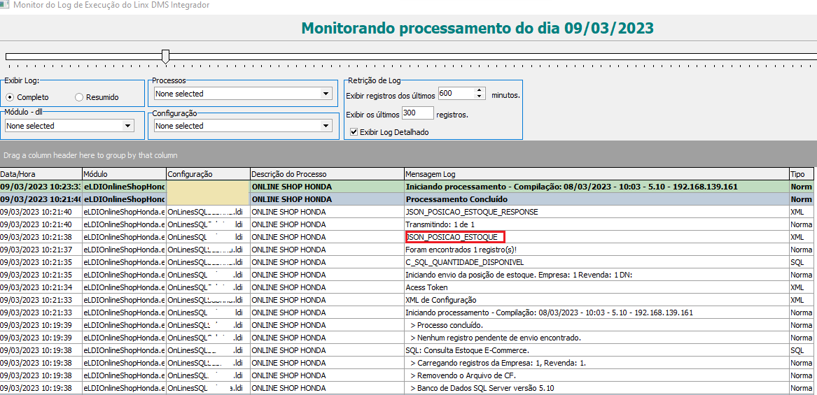 O log de comunicação e, ou, exportação é apresentado no botão "Consulta Log do Integrador", onde são apresentadas mensagens relevantes sobre os processos DMS-Montadoras realizados.
