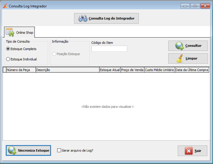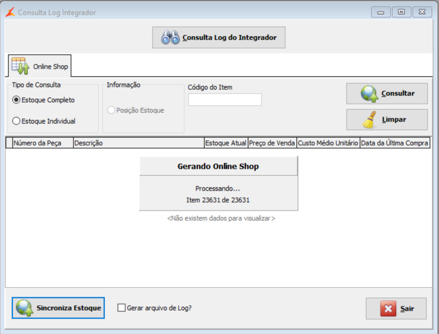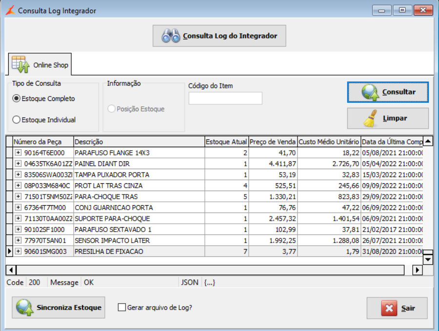 Esse log será salvo com o nome "Online Shop_xxxxxxxx.log de acordo com a data de geração, pode ser utilizado principalmente para conferências de valores e saldo dos itens enviados, caso seja necessário tal validação junto a montadora.