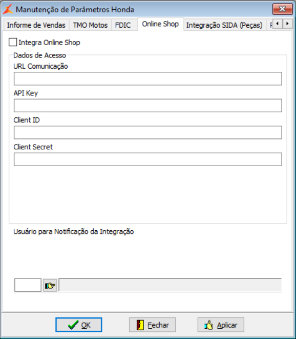 - Usuário para notificação da Integração: Selecione um usuário para o envio das notificações das comunicações das APIs disponibilizadas entre DMS e Montadora, caso seja necessária uma notificação