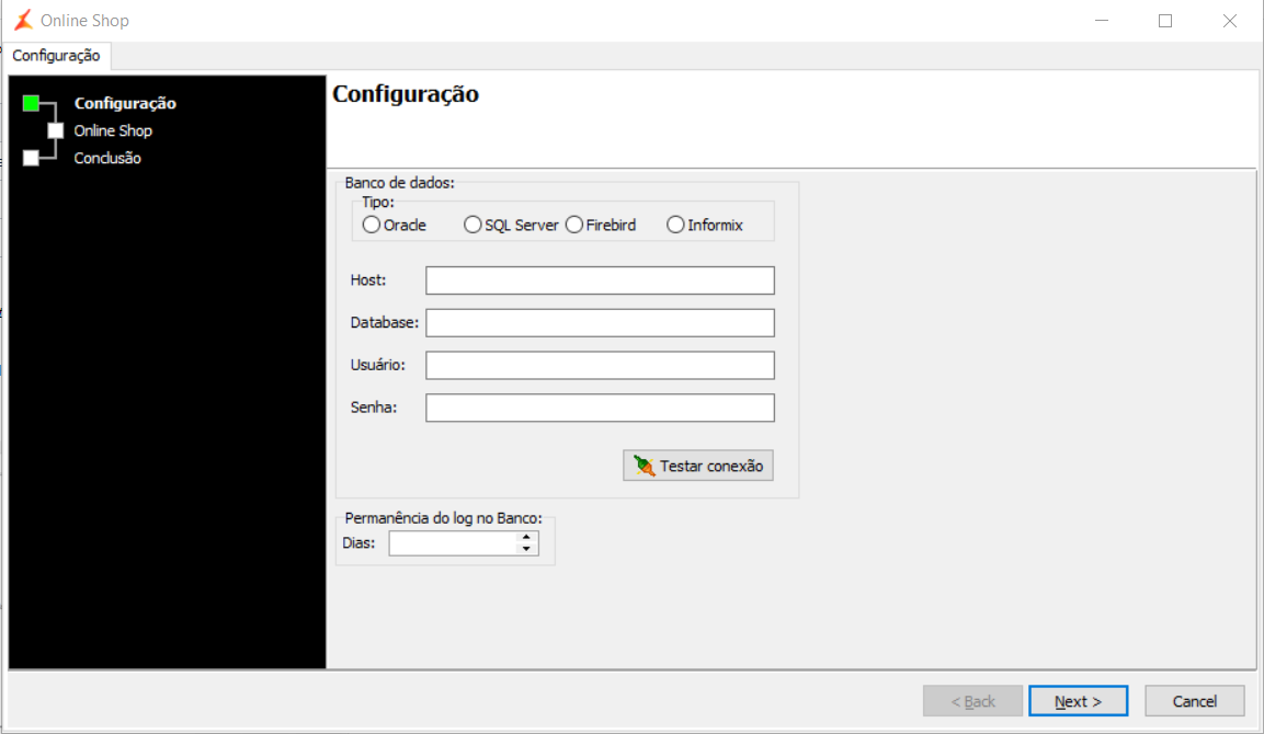 - Na aba "Configuração", preencha os dados de acesso ao Banco de Dados;