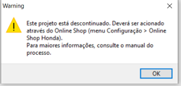 Se o usuário tentar usar o processo antigo do Bi Parts Honda, será exibido uma mensagem: