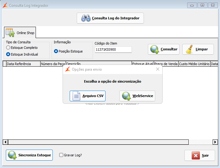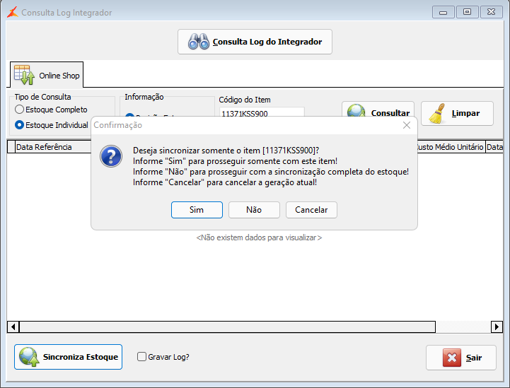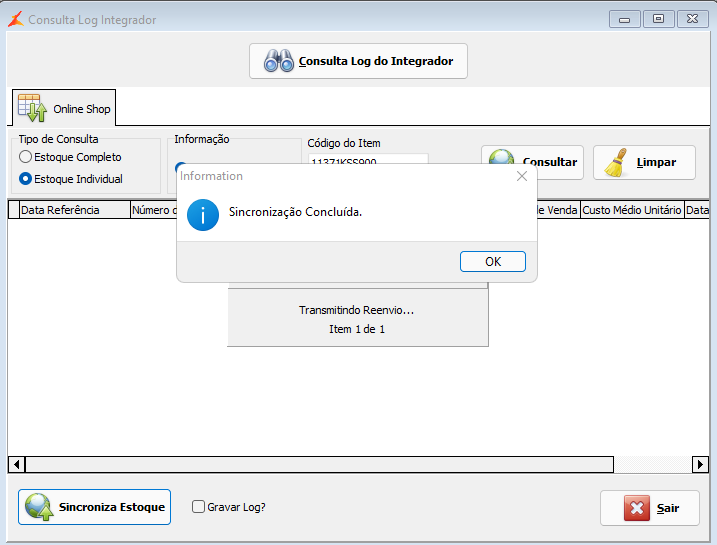 Após informar o código do item e clicar em Sincroniza Estoque, será gerado o alerta em tela: