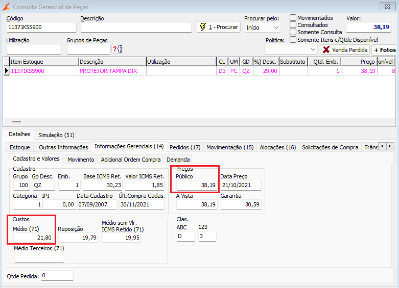 Sobre o Valor unitário de venda, esclarecemos que o valor considerado sempre será o praticado pela concessionária, portanto, é enviado o valor "Público". O valor de custo enviado será o que é apresentado no campo Custo Médio (71).
