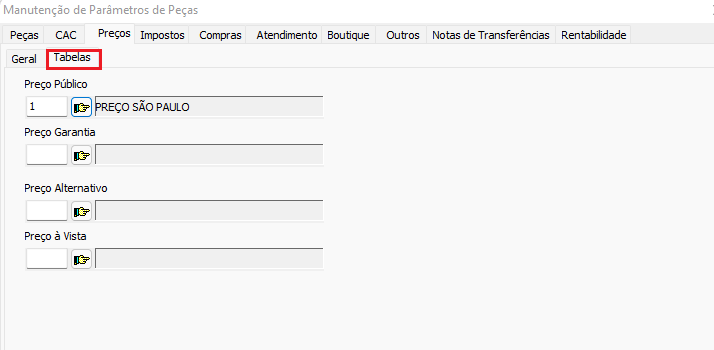 Para concessionárias que praticam o uso da "Tabela de preços", especificada no parâmetro de Peças em Peças - Parâmetros- aba Preços - Tabelas.