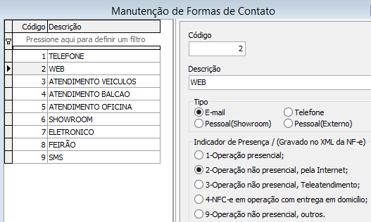 Verifique se a forma de contato, utilizada para contatos WEB, está marcada com o tipo "E-mail". Se não estiver, realize a marcação.