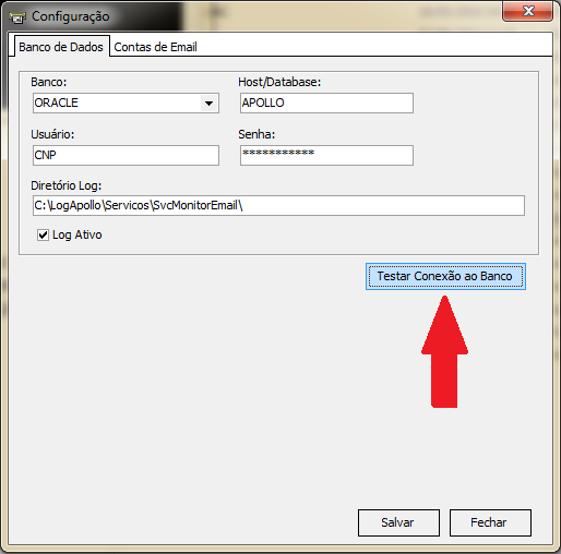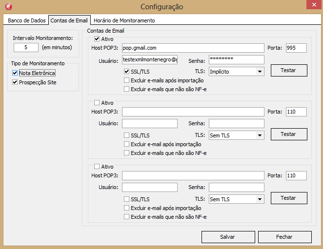 - Informe os parâmetros de contas de e-mail e teste a conexão com o botão adequado. Marque "Ativo" nas contas que serão monitoradas.