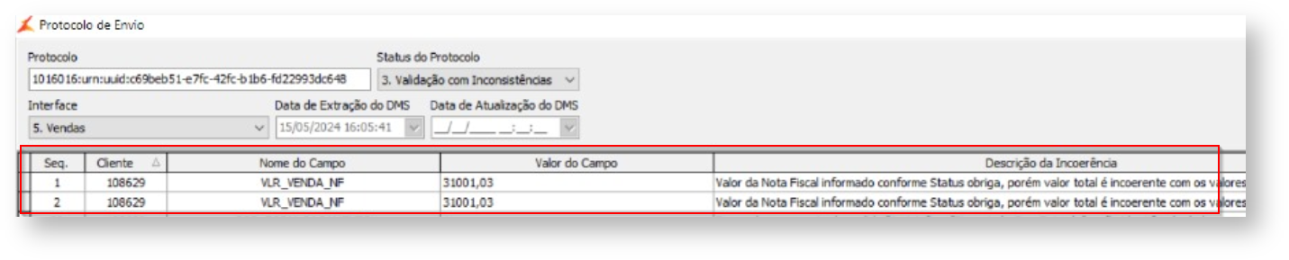 Ao consultar o protocolo, logo identificará que as informações foram enviadas duplicadas, conforme exemplo abaixo: