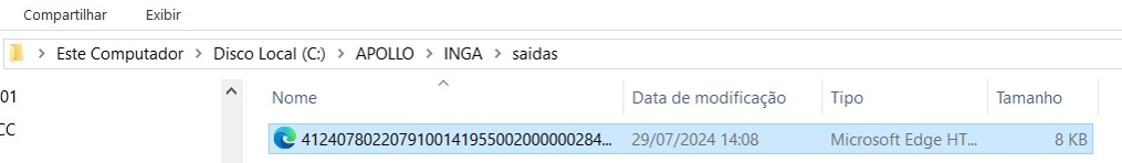 Neste exemplo, o xml esta na pasta Saída, conforme mapeado em   Configuração > Cadastro > Empresas e Revendas > aba NFe > Integração INGA, Notas Emitidas-Próprias (pasta PROC).