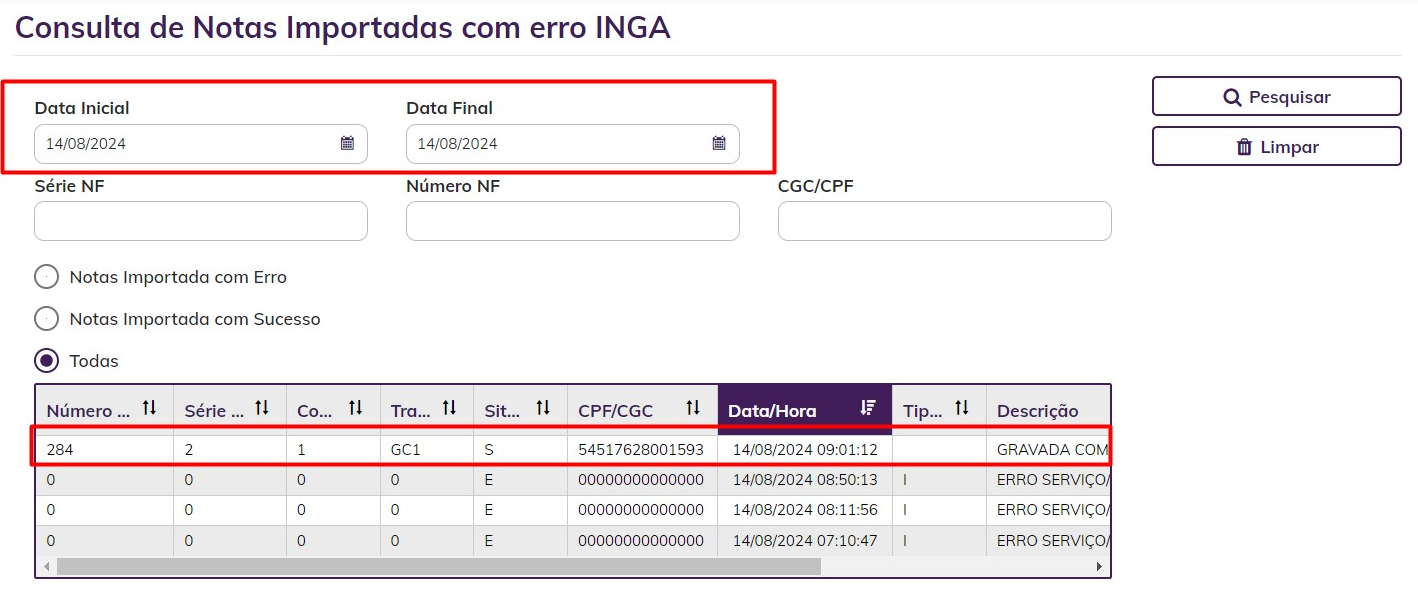 Faturamento > Consultas / Relatórios > Notas Importadas Com Erro INGA