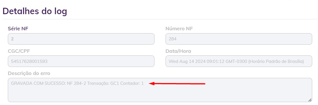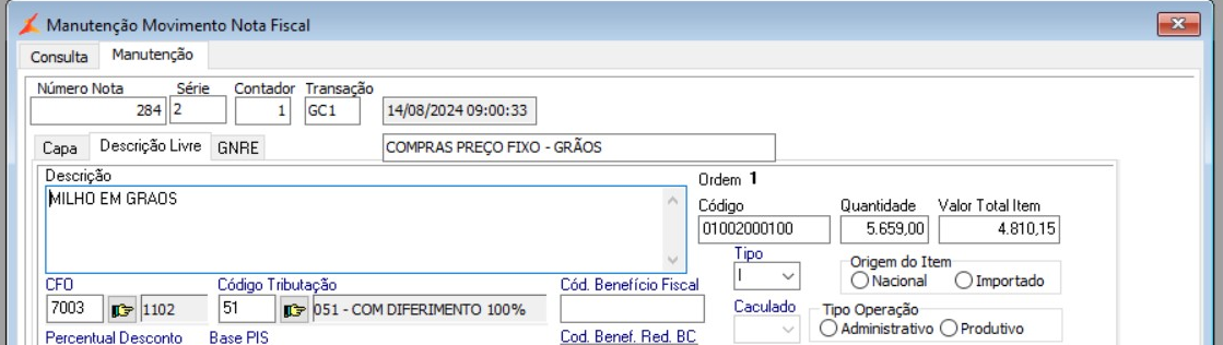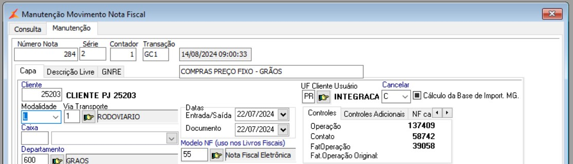 Ao clicar em  o sistema já efetuou a integração da nota fiscal e a mesma apresentou a mensagem:  GRAVADA COM SUCESSO: NF 284-2 Transação: GC1 Contador: 1.