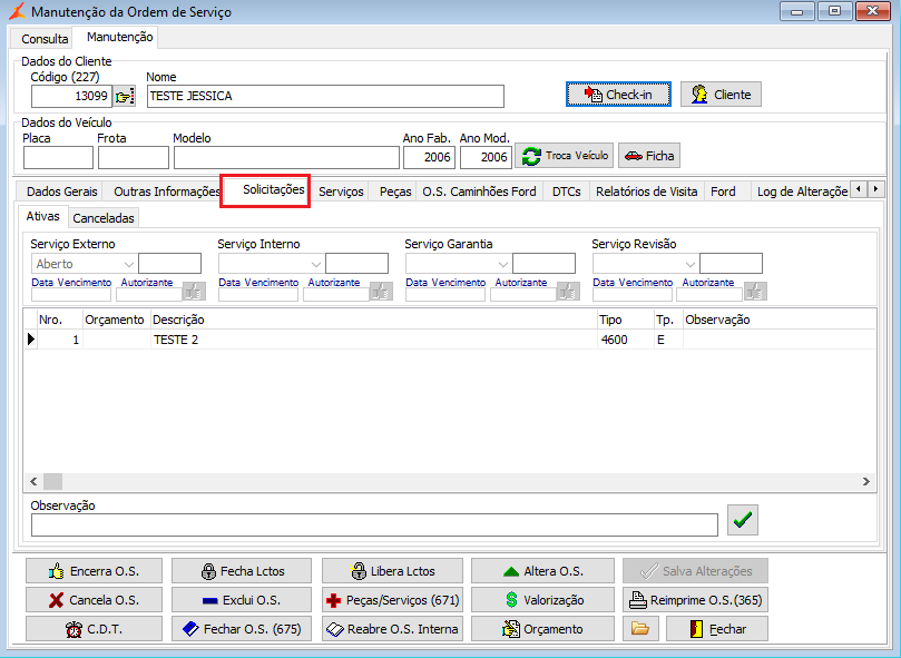 - Acessar o menu (70780) Oficina > Ordem de Serviço > Manutenção, localizar a O.S., acessar a aba solicitações e verificar se há alguma solicitação sem peças/serviços em aberta.