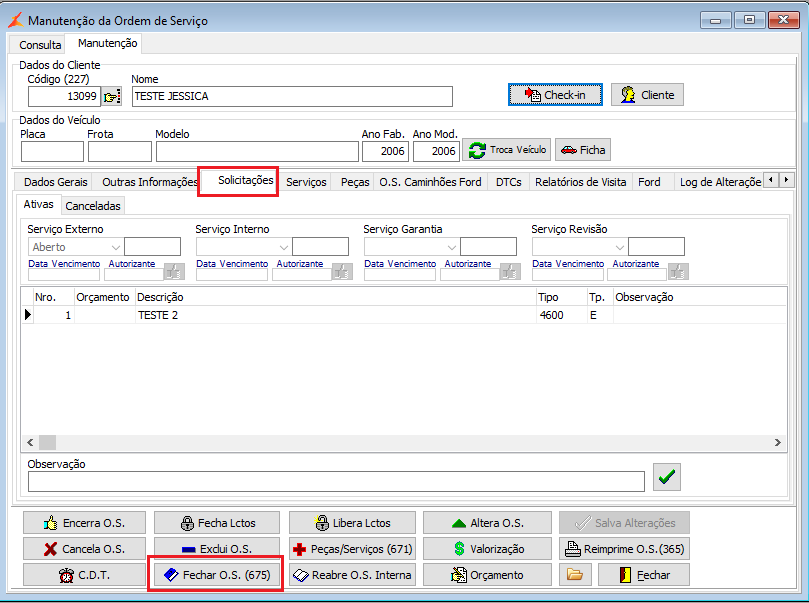 Se tiver alguma solicitação aberta sem peças/serviços vinculado, clicar no botão <Fechar O.S.>;