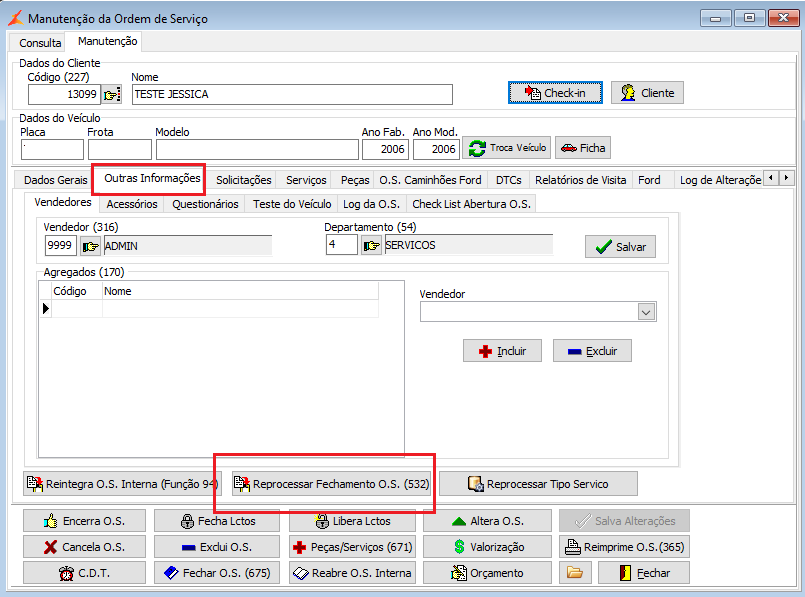 Obs.: Para habilitar o botão <Reprocessar Fechamento O.S. (532)>, usuário precisa ter a função 532 - REPROCESSAR FECHAMENTO DA O.S. liberada.