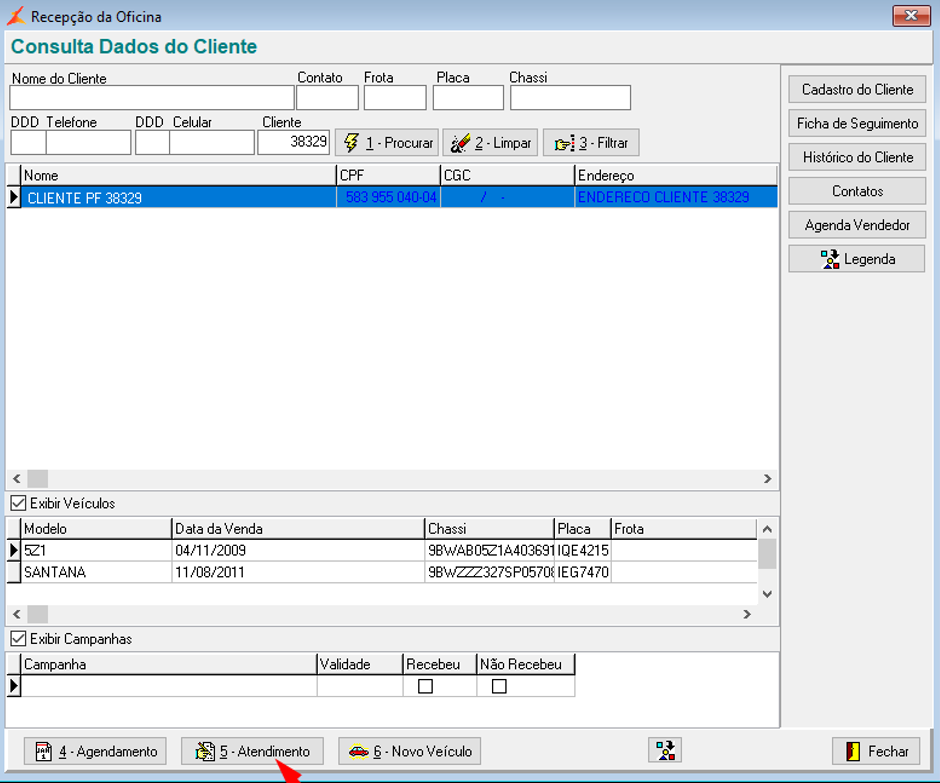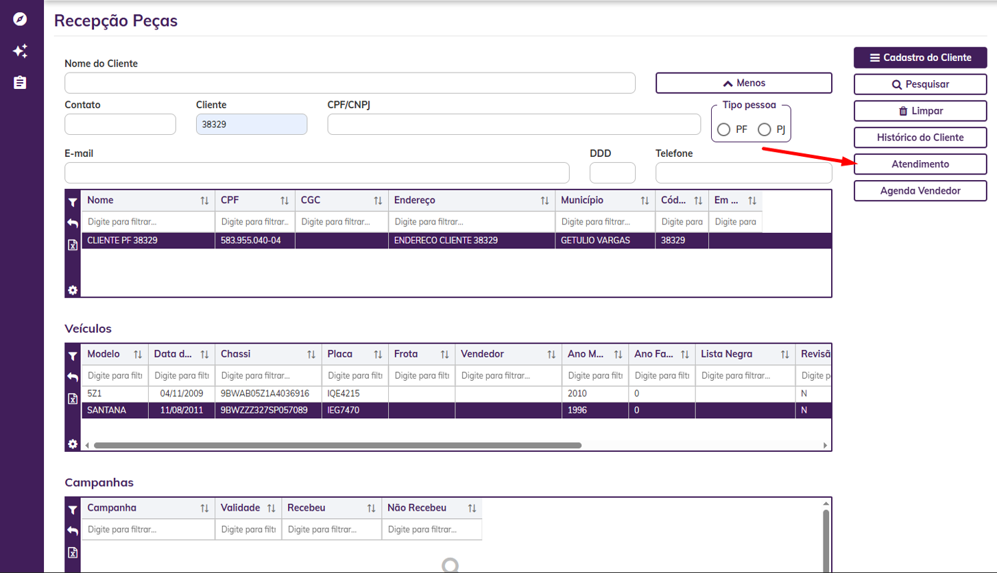 - Passo 1 - Acesse a tela de Recepção da Oficina no sistema, realize a busca do cliente desejado e clique na opção "Atendimento".