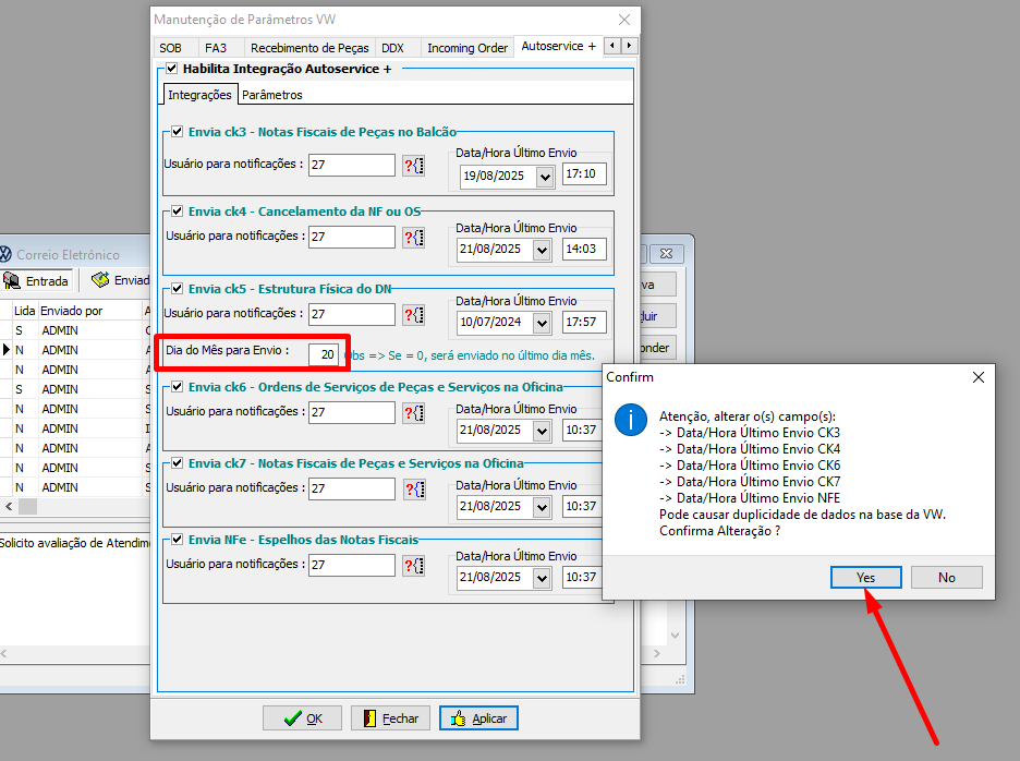 Dia do Mês para Envio: Informe a data em que o registro ck5 deverá ser enviado para o AutoService, deverá ser transmitido uma única vez ao mês.