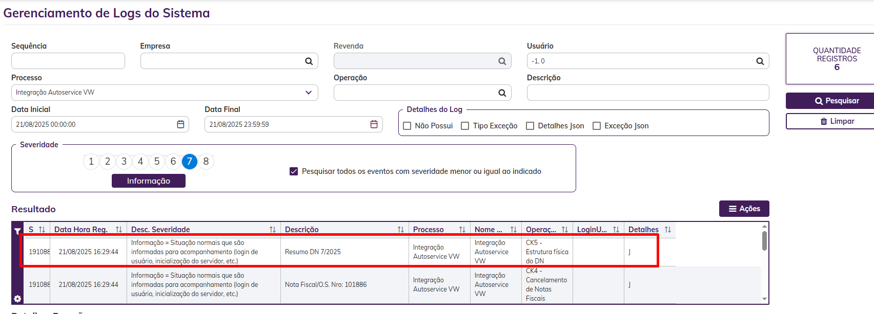 - Passo 3 - Após realização da configuração dos parâmetros, realizar a conferência dos logs do CK5.