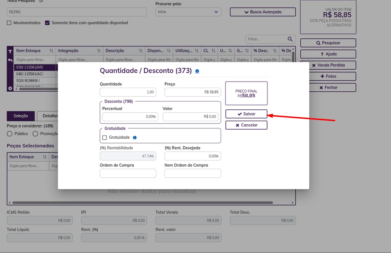 Figura 10: Linx DMS > Peças > Atendimento Balcão - Passo 11 - Na modal de confirmação, clique na opção "Salvar".