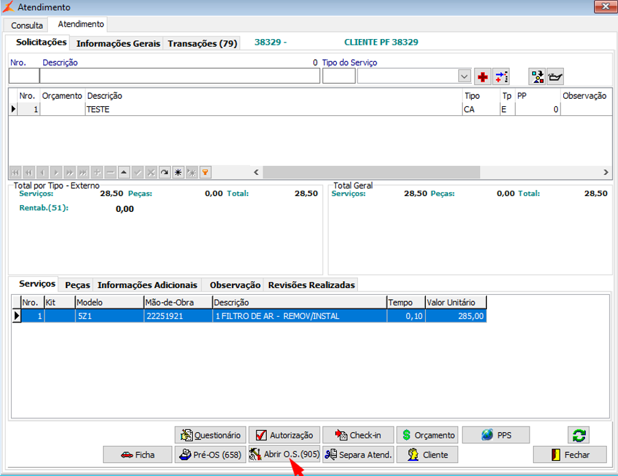 - Passo 5 - Na tela de atendimento, clicar na opção "Abrir" O.S.