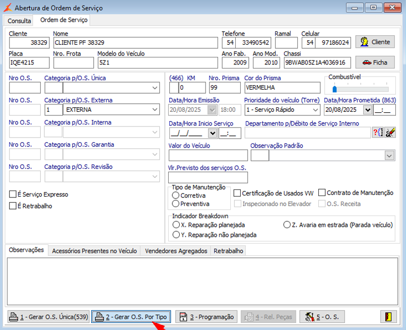 Figura 5: LinxDMSDesktop > Oficina > Atendimento Oficina > Atendimento - Passo 6 - Na tela de abertura da O.S preencher os campos necessários e clicar na opção "Gerar O.S Por Tipo" ou "Gerar O.S Única".