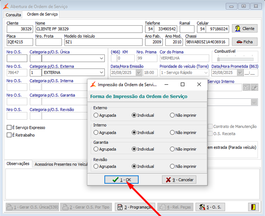Figura 6: LinxDMSDesktop > Oficina > Atendimento Oficina > Atendimento > Abrir O.S - Passo 7 - Na tela de impressão da ordem de serviço, clicar na opção "OK".