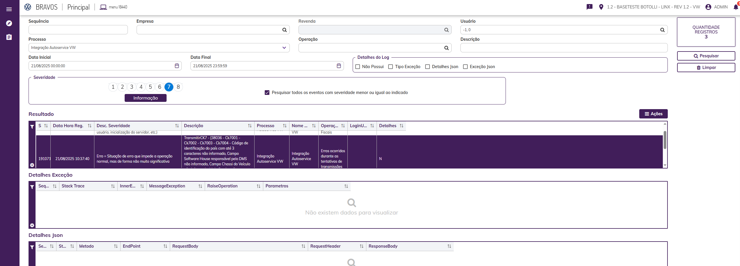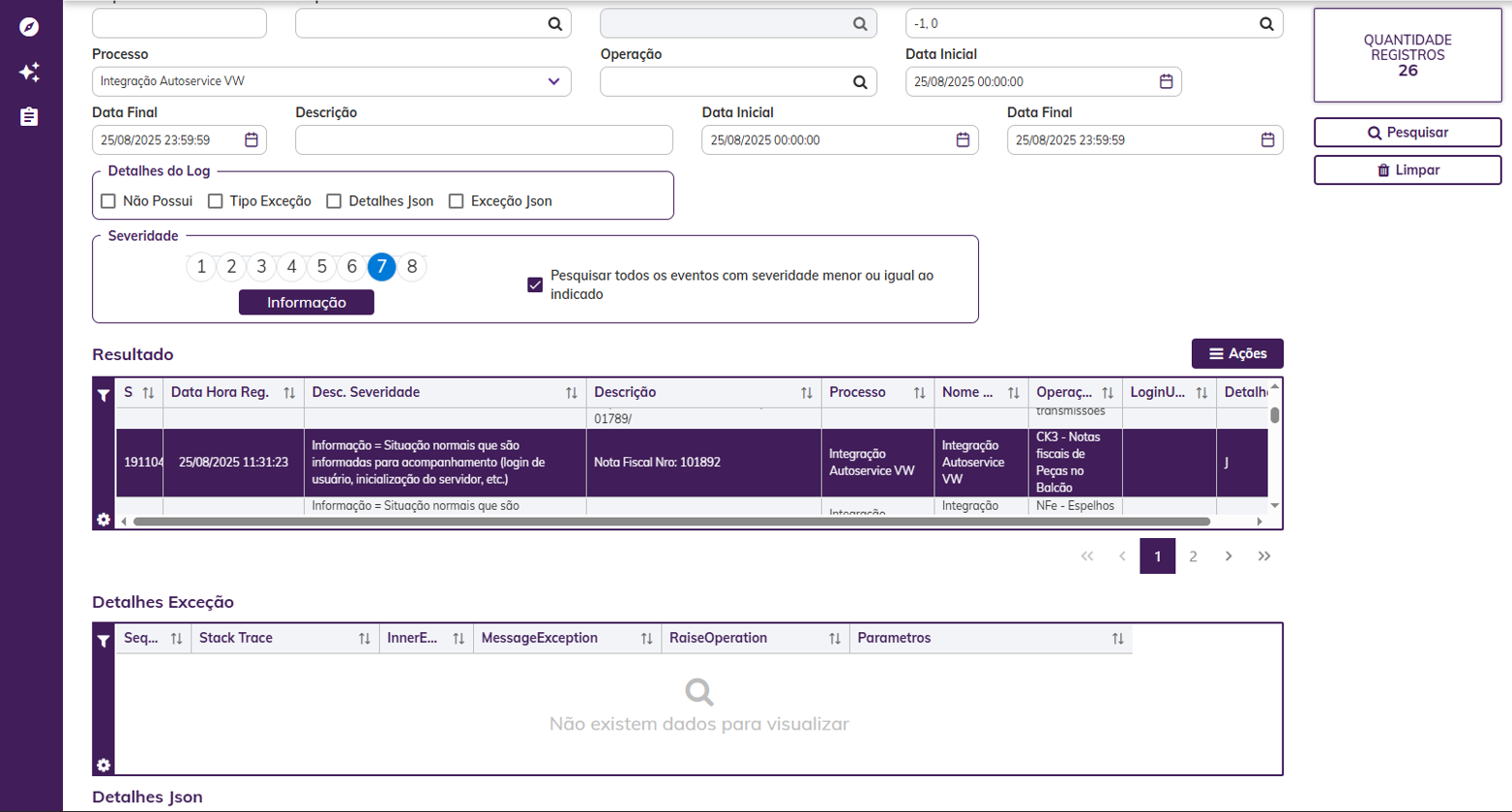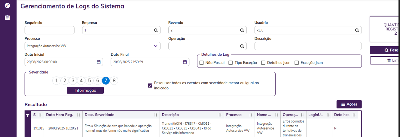 Figura 3: Linx DMS > Configuração > Consulta Log Web > Integração Autoservice VW
