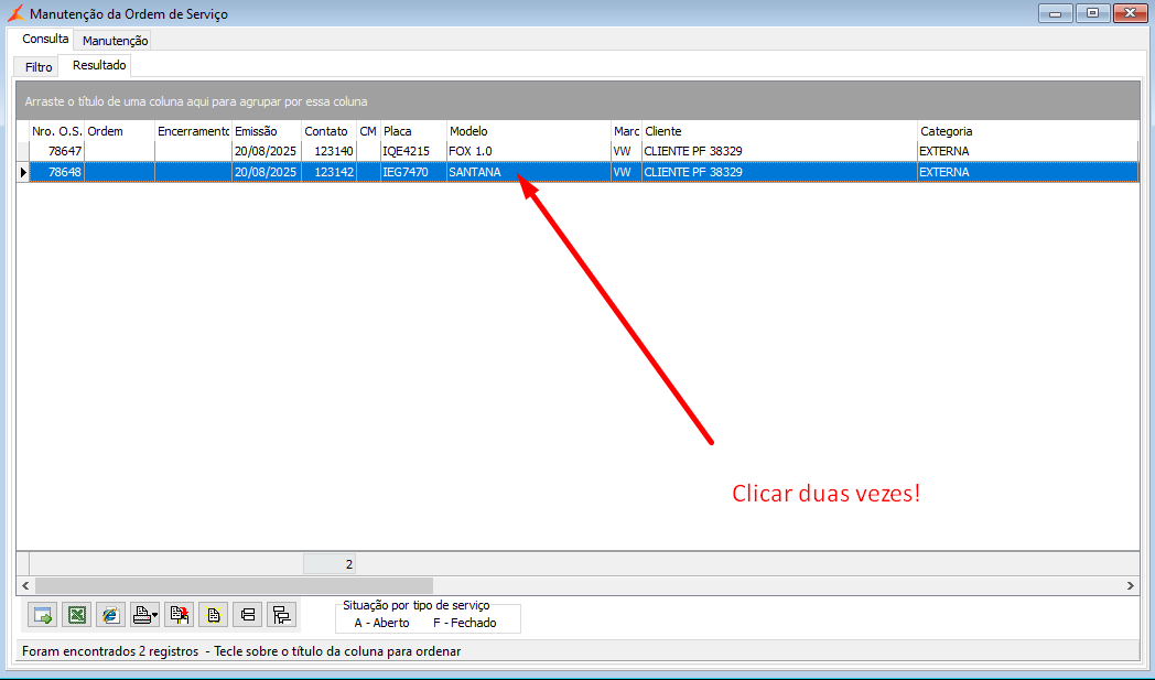 - Passo 1 - Acesse a tela de Manutenção da Ordem de Serviço no sistema, clique duas vezes no registro desejado.