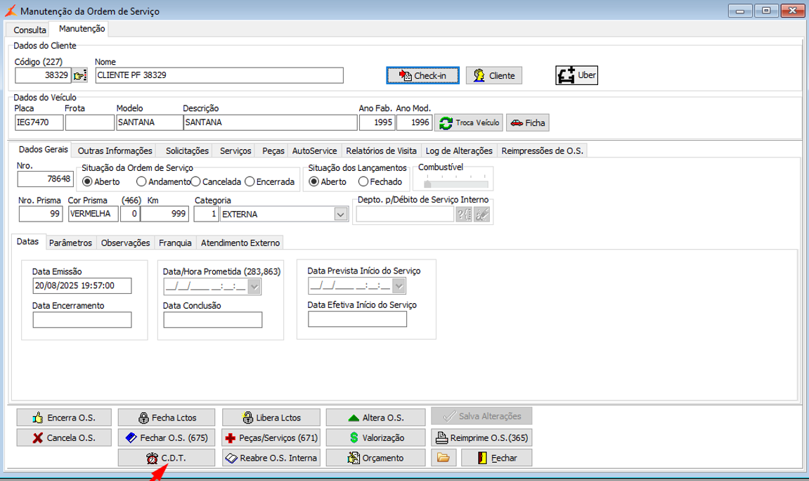 - Passo 2 - Na tela de Manutenção da Ordem de Serviço, clique na opção "C.D.T".