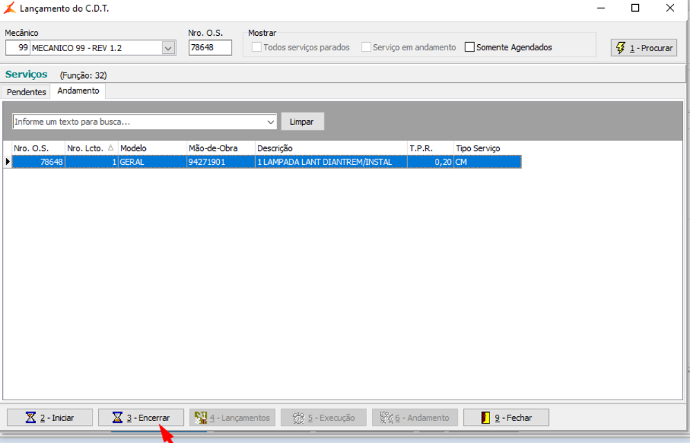 Figura 7: LinxDMSDesktop > Oficina > Ordem de Serviço > Manutenção > Lançamento C.D.T > Iniciar - Passo 8 - Na tela de Manutenção da Ordem de Serviço, clique na opção "Encerra O.S".