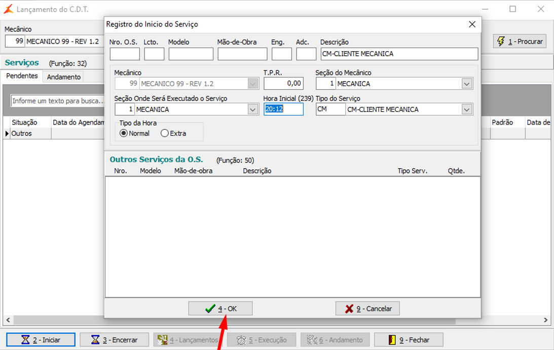 Figura 6: LinxDMSDesktop > Oficina > Ordem de Serviço > Manutenção > Lançamento C.D.T - Passo 7 - Na tela de Registro do Inicio do Serviço, clicar na opção "OK".