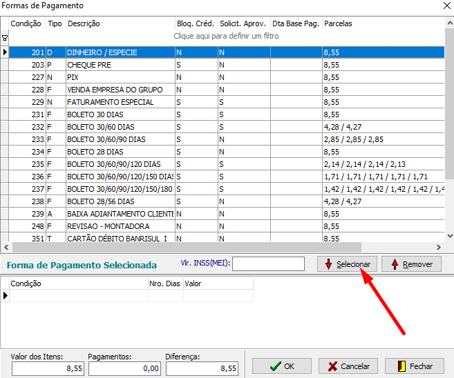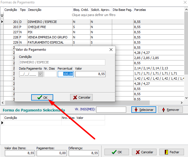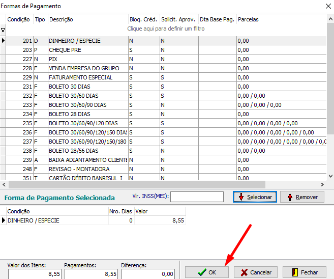 Figura 11: LinxDMSDesktop > Oficina > Ordem de Serviço > Manutenção > Negociação > Formas de Pagamento - Passo 12 - Na tela de Formas de Pagamento com a condição de pagamento selecionada, clique na opção "OK".
