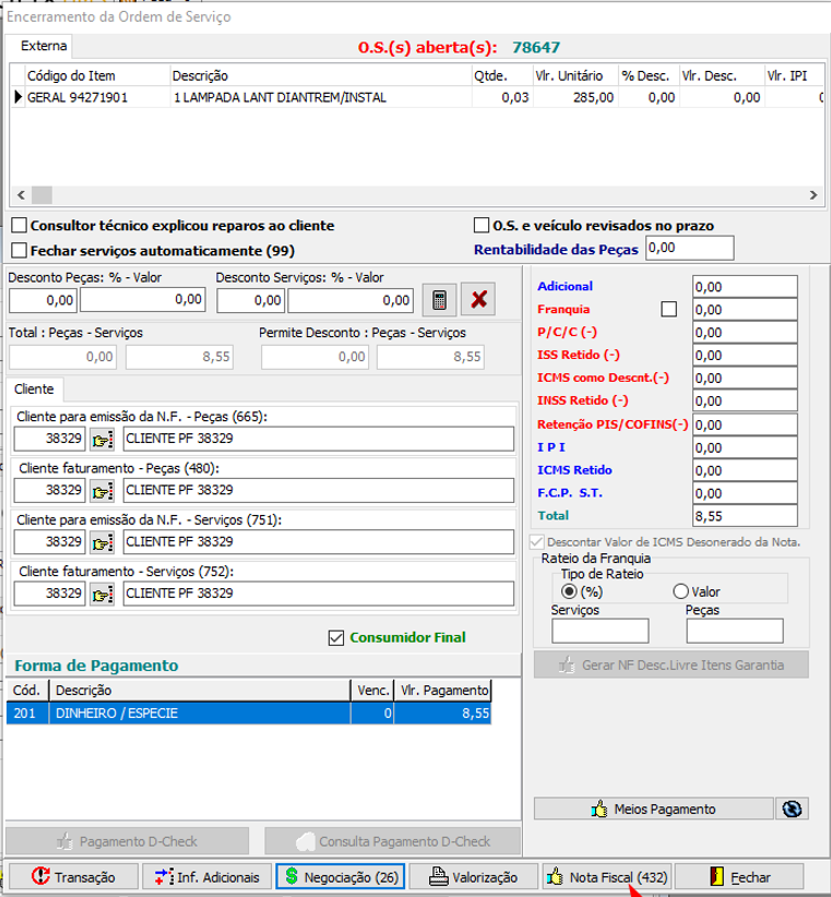 Figura 12: LinxDMSDesktop > Oficina > Ordem de Serviço > Manutenção > Negociação > Formas de Pagamento - Passo 13 - Por fim, clique na opção "Nota Fiscal".