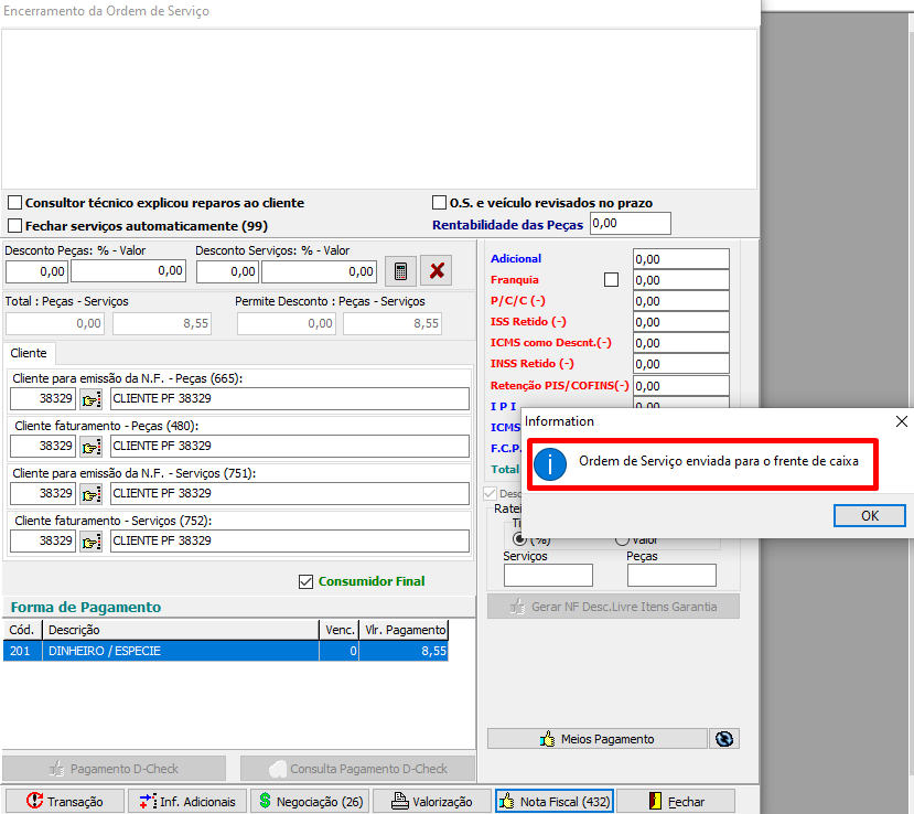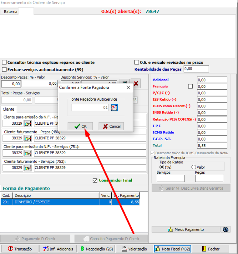 Figura 13: LinxDMSDesktop > Oficina > Ordem de Serviço > Manutenção - Passo 14 - Clique na opção "OK" parar Confirmar a Fonte Pagadora.