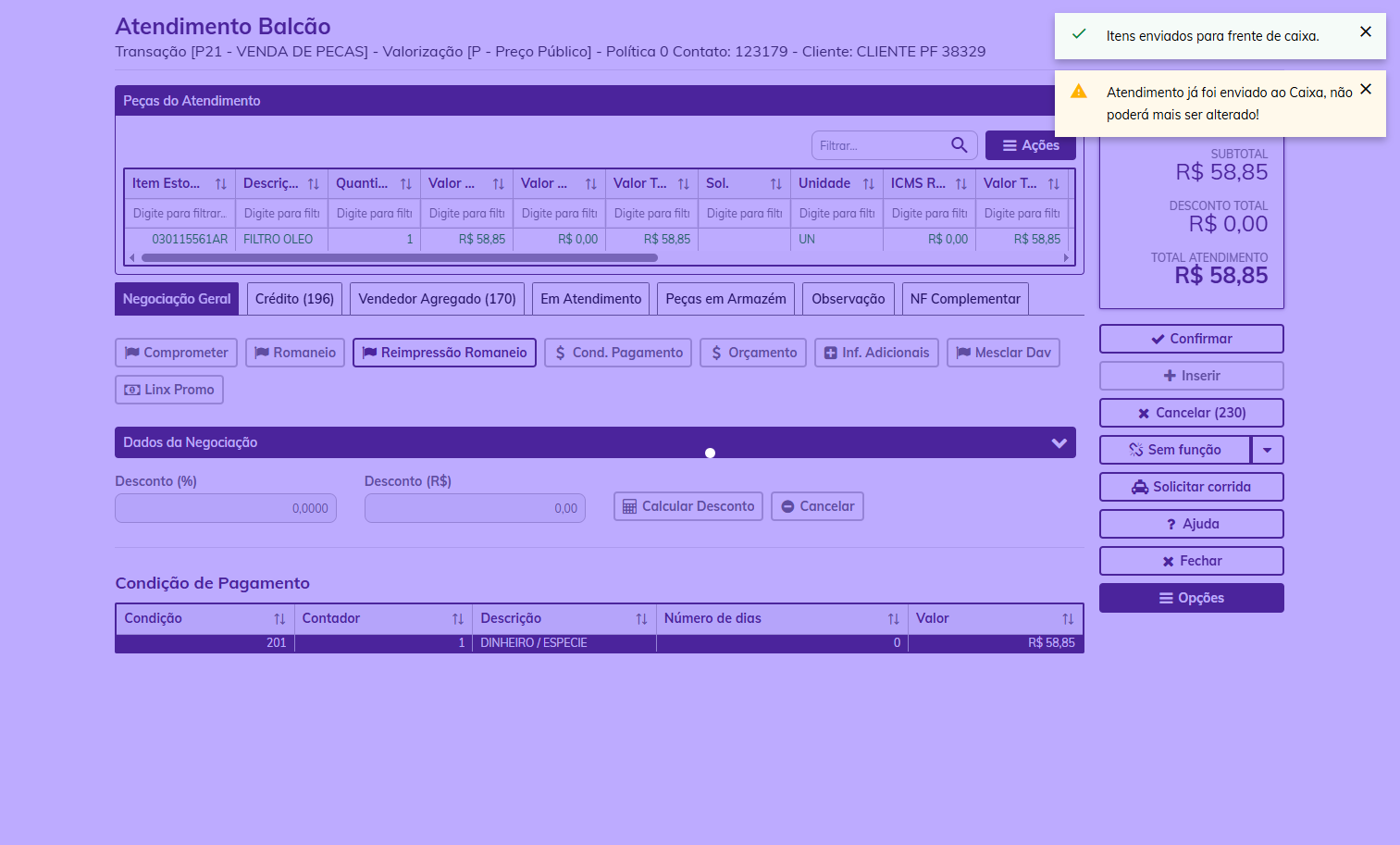 Figura 11: Linx DMS > Peças > Atendimento Balcão - Passo 12 - Após a salvar, o sistema deverá exibir em tela a seguinte mensagem de sucesso: "Itens enviado para frente de caixa".