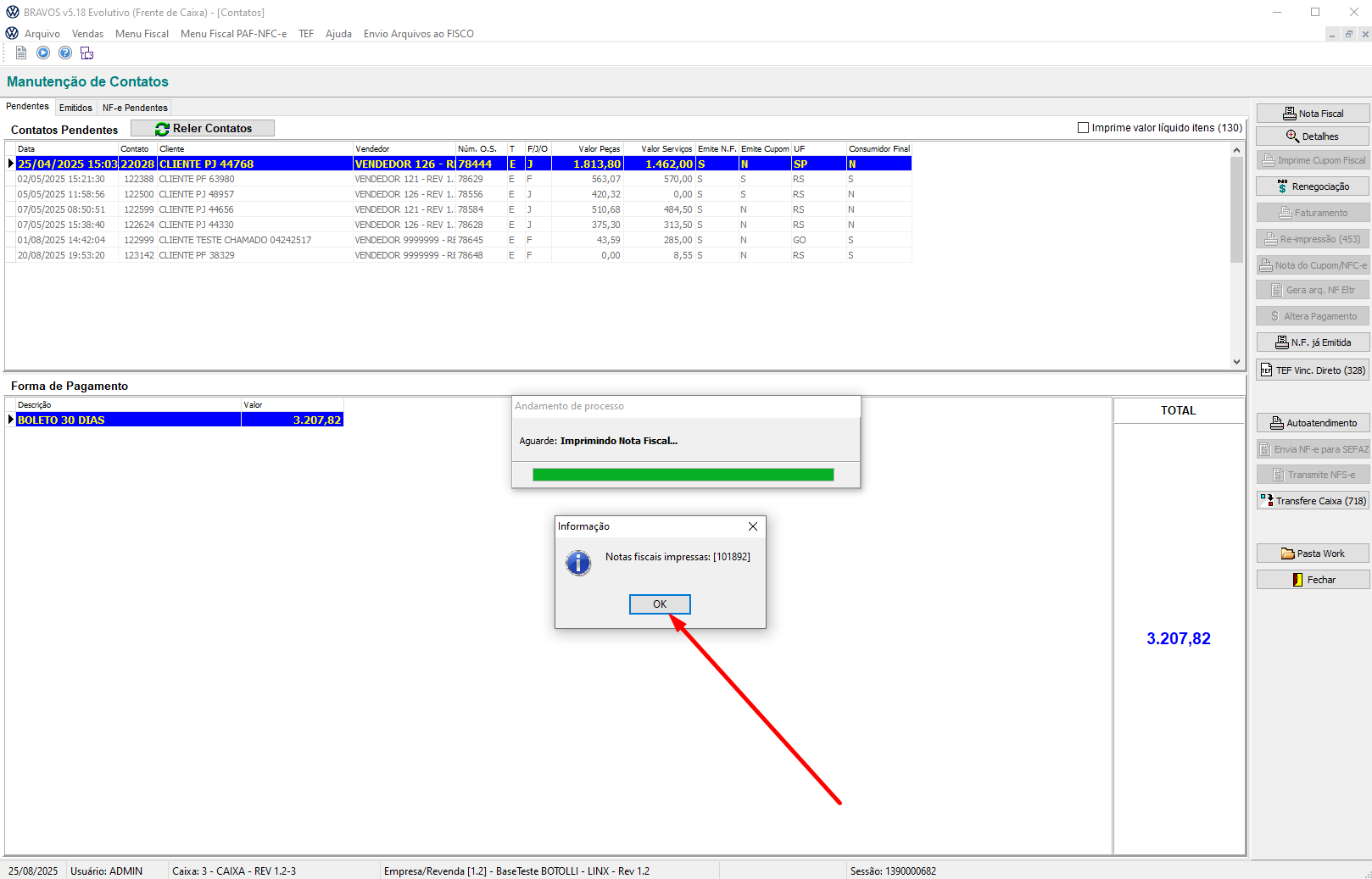 Figura 13: Frente de Caixa > Nota Fiscal - Passo 14 - Após clicar na opção Nota fiscal, deverá retornar a seguinte mensagem de sucesso: "Notas fiscais impressas".