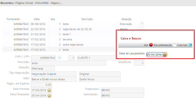 Observação: A efetivação de uma negociação poderá ser realizada somente quando a negociação estiver autorizada.