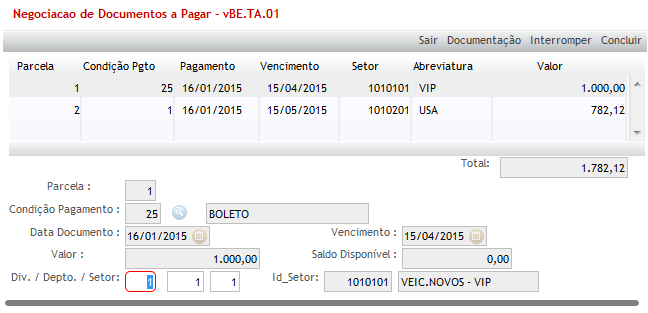 Após a seleção dos documentos desejados, será permitido definir a negociação dos mesmos (valores de correção monetária, juros, multas, descontos), como também a forma de pagamento que será utilizada na negociação.