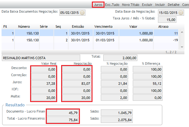 Mesmo que o título ainda não esteja vencido, o sistema permitirá a digitação de valor de juros e multa na coluna "Negociado".