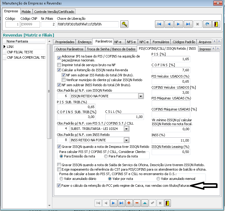No menu "Configuração > Cadastros > Empresas e Revendas", na aba "Parâmetros > PIS/COFINS/CSLL/ ISSQN Retido / INSS" foi incluído o parâmetro "Fazer o cálculo da retenção do PCC pelo regime de Caixa, nas vendas com títulos/faturas.". Quando este campo estiver marcado, o sistema irá calcular o PCC pelo regime de caixa. Ou seja, no encerramento de uma O.S., cujas condições de pagamento utilizadas forem do tipo faturamento, gerando títulos a receber, o sistema irá calcular o valor do PCC, depois que as condições de pagamento tiverem sido informadas e somente se o valor da parcela / título for maior que 215,26 (valor informado no cadastro do cliente) somar o valor respectivo ao serviço. Também irá somar ao valor do título da nota que está sendo gerados, os valores respectivos aos serviços dos outros títulos que estiverem vencendo na data de vencimento dos títulos já gerados, e que ainda não foram considerados em notas anteriores. Só somará títulos que tiverem algum valor no campo "Vlr. Serviços deste PCC". Veja a imagem:
