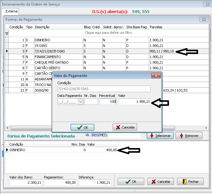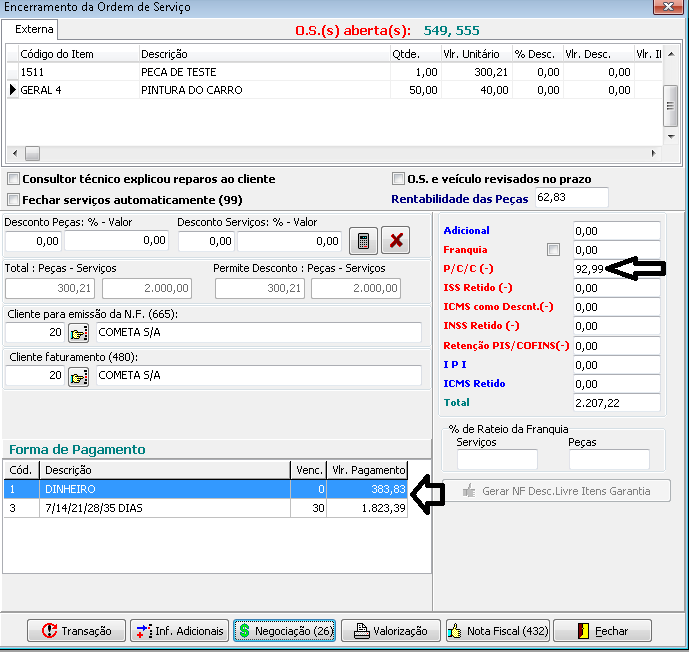 No encerramento da O.S., ao entrar na tela do menu "Oficina > Ordem de Serviço > Manutenção" opção "Encerrar O.S.", o PCC só será calculado após a informação das condições de pagamento. Quando é informado o valor de uma parcela à vista, e o no valor proporcional dos serviços nesta parcela será maior que R$ 215,26, o sistema calculará o valor do PCC desta parcela a vista, usando a regra de 3. Por exemplo, se os valores da O.S. forem de: