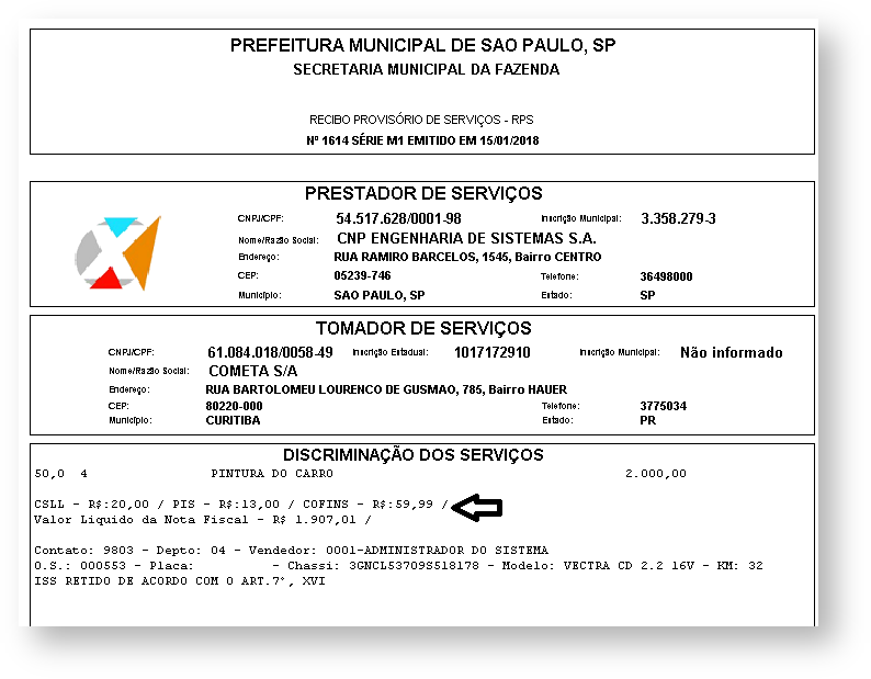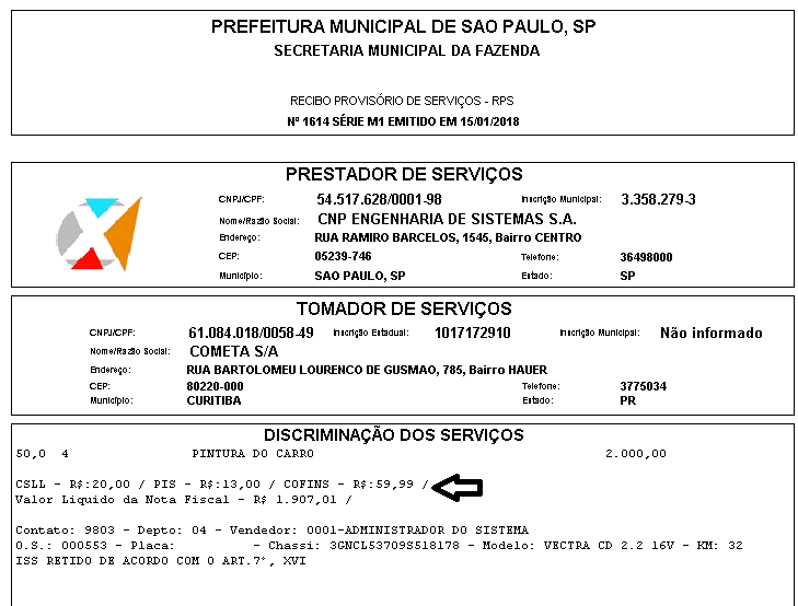 (Figura 4: Impressão do RPS - Valores do CSLL/PIS/COFINS)