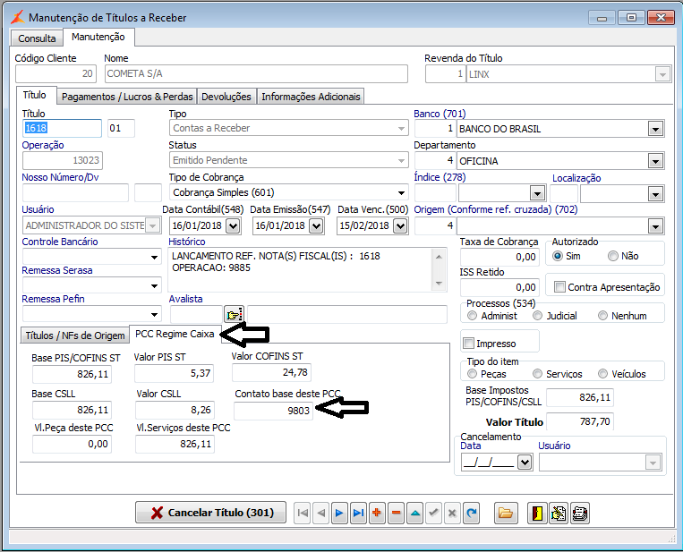 (Figura 5: Tela de Manutenção de Títulos a Receber - aba "PCC Regime Caixa")