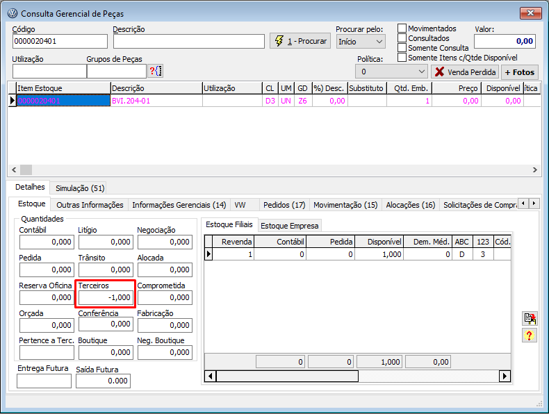 Ao consultar um item em Peças > Consultas > Itens do estoque, o item está negativo no campo "Terceiros" conforme imagem abaixo: