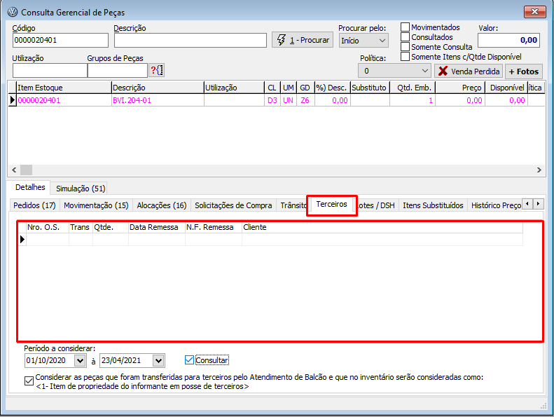 Ao verificar a aba "Terceiros" no mesmo menu, as movimentações estão em branco: