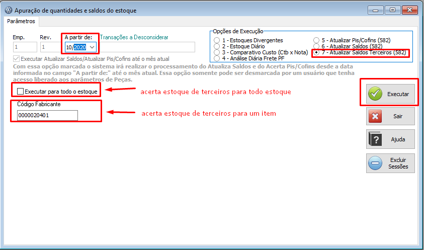 Obs.: Caso seja executado para todo o estoque o atualiza saldos deve ser fora de expediente, sem ninguém acessando o sistema.
